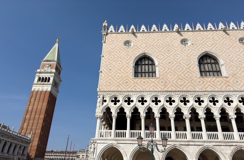 Von der Rialtobrücke aus gibt es mehrere Wege zum Markusplatz, die alle ca. 500m lang sind und 7-10 Minuten Fußweg bedeuten. Wir haben irgendeinen dieser Wege genommen, der uns durch kleine Gassen führte, wo viele Cafés und Delikatessengeschäfte versteckt waren. Wir folgten da einfach immer dem Strom:-), bis wir zum Markusplatz gelangten und dort etwas von den Menschenmassen erschlagen wurden. Wir waren dort um ca. 15:30h. Es war wirklich brechend voll. Sämtliche Cafés waren voll. Die Schlagen vor dem Dogenpalast waren meterlang. Wir haben uns ja bei diesem Trip bewusst gegen Innenbesichtigungen entschieden, weil uns das im Rahmen eines Tagesausflugs zu stressig war. Und wir haben es nicht bereut. Unsere kleine Tochter wollte auch den Markusplatz schnell wieder verlassen. Es war ihr einfach zu trubelig und mir auch. Aber ein paar schöne Fotos von der atemberaubenden Fassade des Dogenpalastes mussten sein.